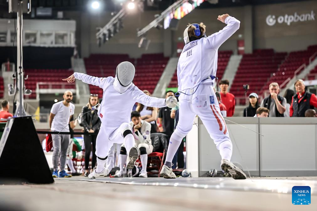 Zhang Xinkun (L) of China competes against Josef Mahringer of Austria at the FIE Westend Grand Prix in Budapest, Hungary, on April 18, 2026. (Photo by David Balogh/Xinhua)