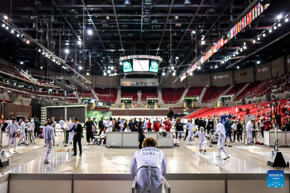 Zhang Xinkun of China (front) prepares at the FIE Westend Grand Prix in Budapest, Hungary, on April 18, 2026. (Photo by David Balogh/Xinhua)