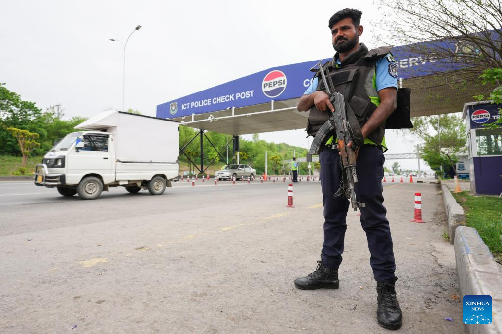 An armed policeman stands guard at a checkpoint in Islamabad, Pakistan, April 17, 2026. (Xinhua/Chen Zeguo)