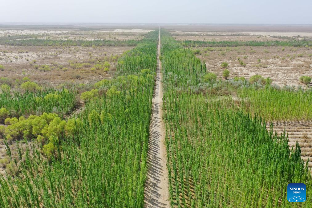 A drone photo taken on April 17, 2026 shows a shelterbelt in Makit County, northwest China's Xinjiang Uygur Autonomous Region.
