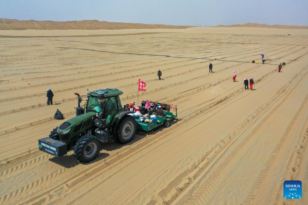 Villagers transplant roses and Scutellaria baicalensis, a plant used in traditional Chinese medicine, and lay drip irrigation tapes on the Taklimakan Desert in Yutian County, northwest China's Xinjiang Uygur Autonomous Region, April 15, 2026.