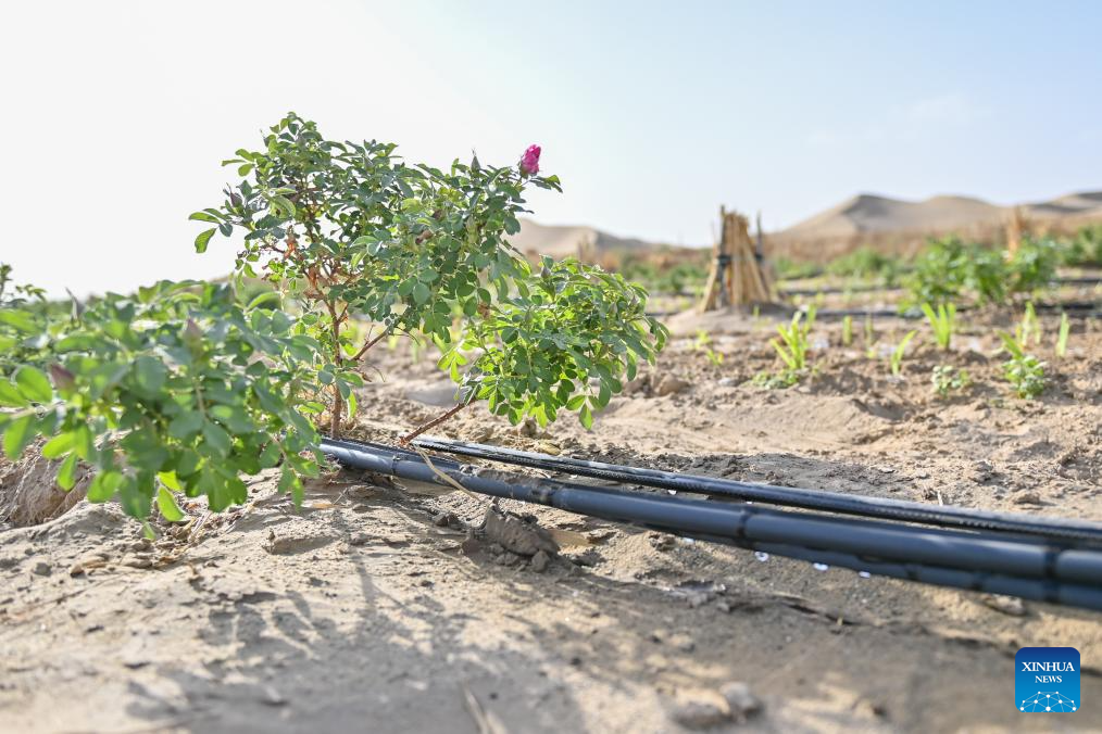 This photo taken on April 15, 2026 shows rose seedlings at the Taklimakan Desert in Yutian County, northwest China's Xinjiang Uygur Autonomous Region.