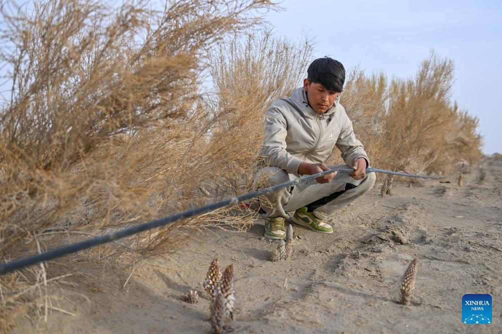 A villager carries dry reeds to be made for straw checkerboard barriers on the Taklimakan Desert in Yutian County, northwest China's Xinjiang Uygur Autonomous Region, April 15, 2026.