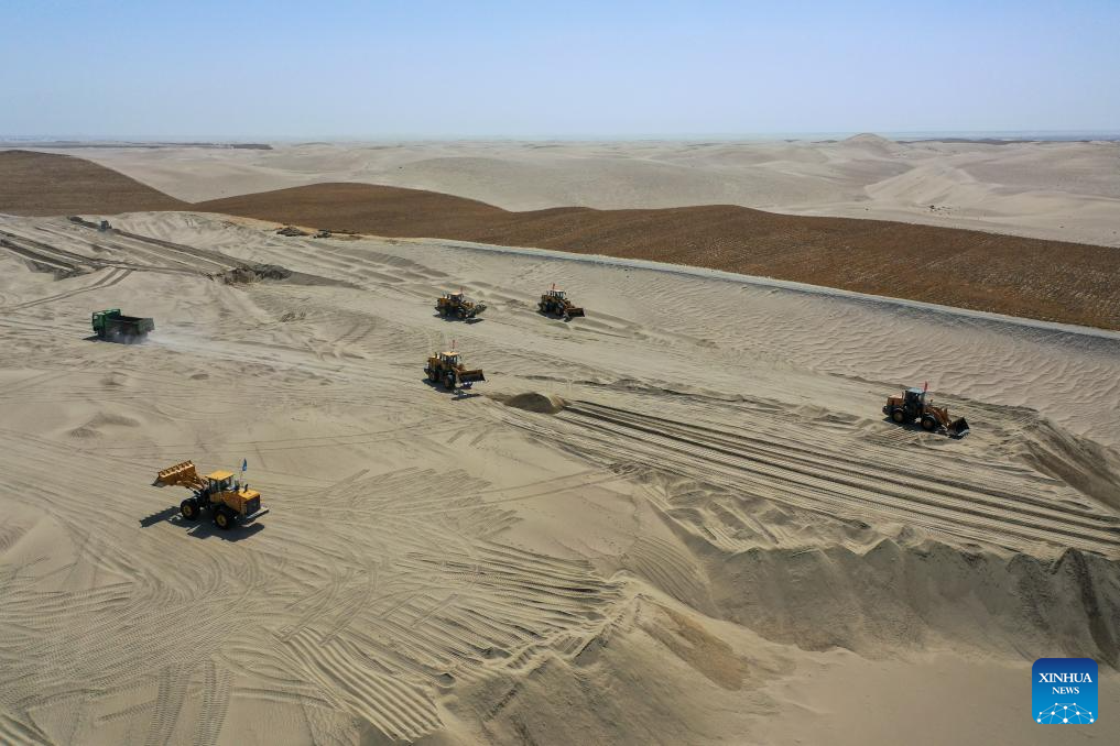 An aerial drone photo shows machines flattening sand dunes in Hotan County, northwest China's Xinjiang Uygur Autonomous Region, April 16, 2026.