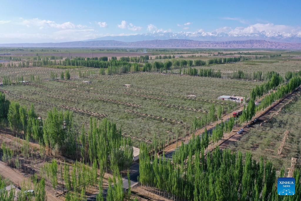 Along the southern edge of Taklimakan Desert, vibrant green barriers extend into the horizon, where fruit trees take root in and sand-fixing forests stand resilient against the desert sands, reflecting the growing ecological and economic vitality of southern Xinjiang in far western China.