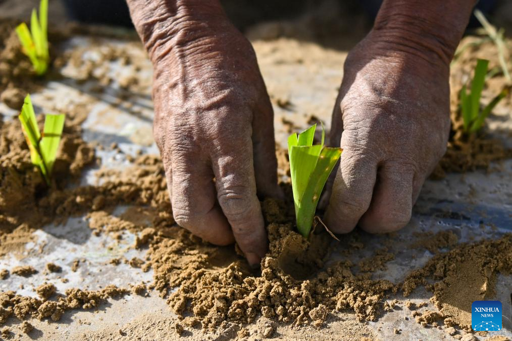A villager plants Belamcanda chinensis, a plant used in traditional Chinese medicine, in Yutian County, northwest China's Xinjiang Uygur Autonomous Region, April 15, 2026.