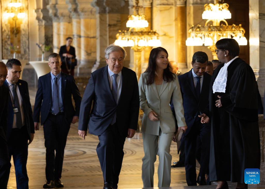 UN Secretary-General Antonio Guterres (C, L) and Annalena Baerbock (C, R), president of the United Nations General Assembly, arrive to attend a solemn sitting to commemorate the 80th anniversary of the inaugural session of the International Court of Justice (ICJ) in The Hague, the Netherlands, on April 17, 2026. (Photo by Sylvia Lederer/Xinhua)