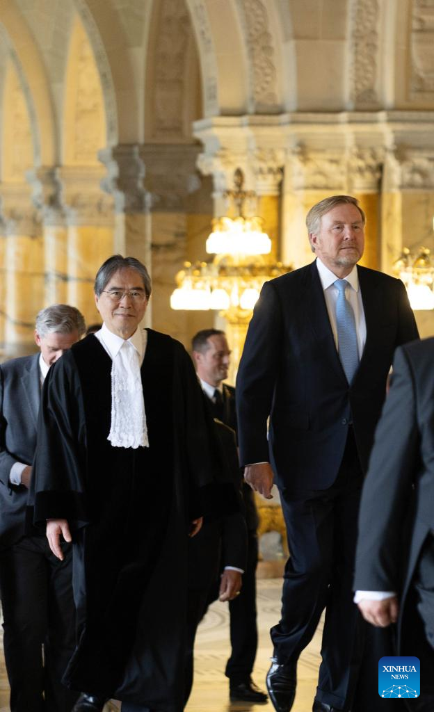 Dutch King Willem-Alexander (R) and Iwasawa Yuji, president of the International Court of Justice (ICJ), arrive to attend a solemn sitting to commemorate the 80th anniversary of the inaugural session of the International Court of Justice (ICJ) in The Hague, the Netherlands, on April 17, 2026. (Photo by Sylvia Lederer/Xinhua)