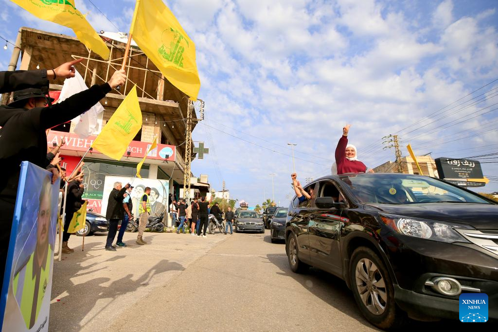 Photo taken on April 17, 2026 shows displaced people from southern Lebanon returning to their homes after the ceasefire, raising flags of Hezbollah in Qasmiyeh, Lebanon. A 10-day ceasefire between Israel and Lebanon took effect on Friday, following an announcement earlier by U.S. President Donald Trump. (Photo by Ali Hashisho/Xinhua)