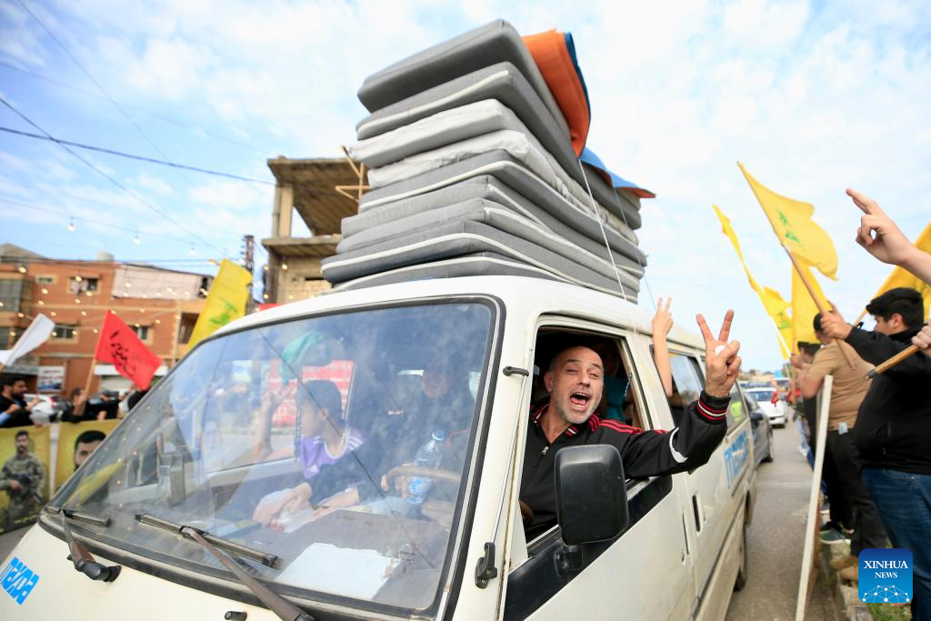 Photo taken on April 17, 2026 shows displaced people from southern Lebanon returning to their homes after the ceasefire, holding portrait of the late Hezbollah leader Sayyed Hassan Nasrallah in Qasmiyeh, Lebanon. A 10-day ceasefire between Israel and Lebanon took effect on Friday, following an announcement earlier by U.S. President Donald Trump. (Photo by Ali Hashisho/Xinhua)