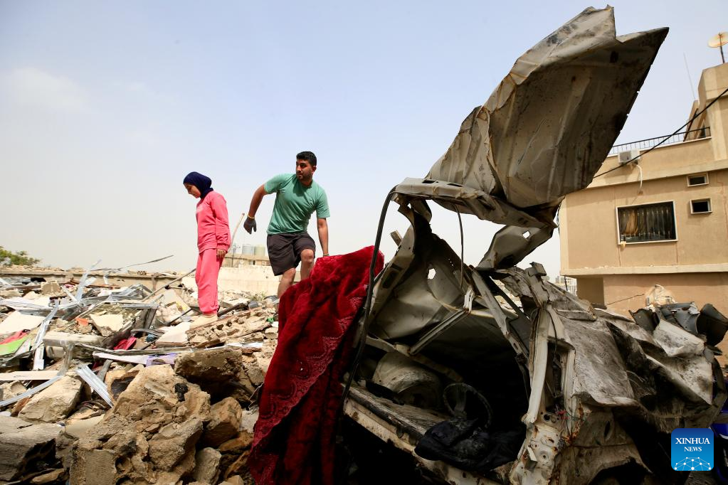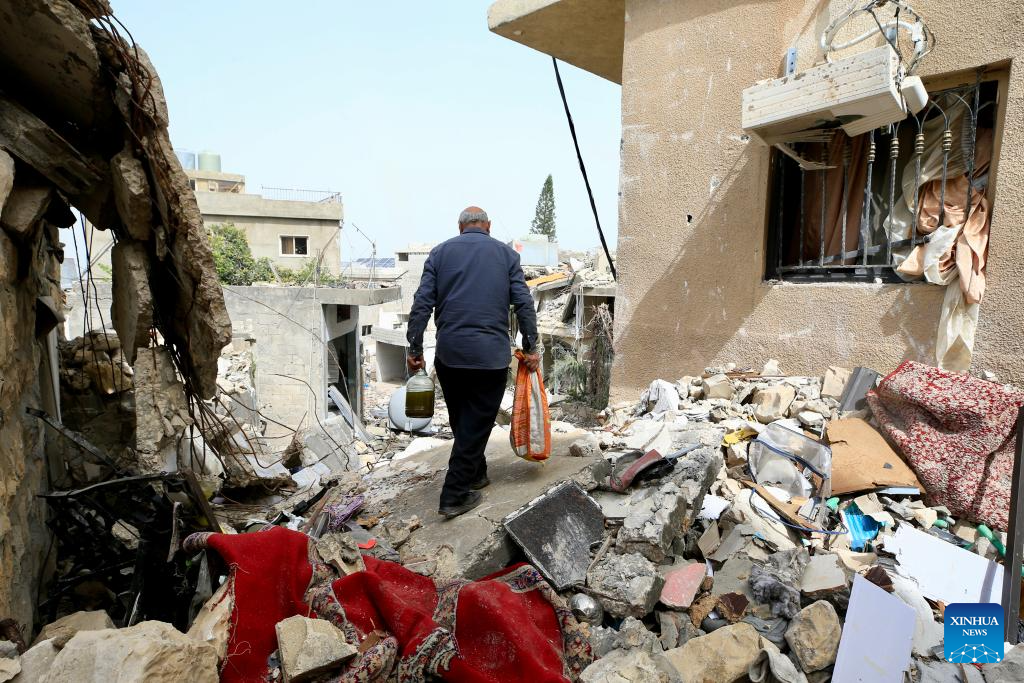Displaced people who have returned to their town inspect houses destroyed in Israeli attacks in Jibchit, Lebanon, April 18, 2026. A 10-day ceasefire between Israel and Lebanon took effect at midnight between Thursday and Friday local time (2100 GMT), following an earlier announcement by U.S. President Donald Trump. (Photo by Ali Hashisho/Xinhua)