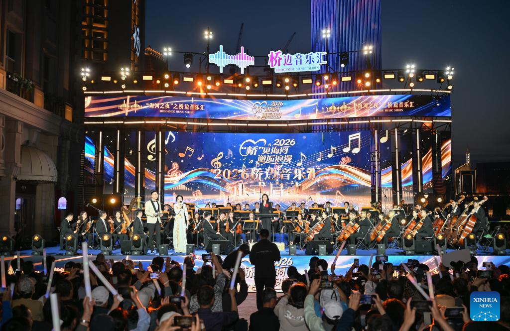 Citizens and tourists watch a music performance at the Jinwan Square by the Haihe River in north China's Tianjin, April 18, 2026. The Bridgeside Music Series kicked off here on Saturday. This event has been held for two consecutive sessions, and this year's performances will last until October.