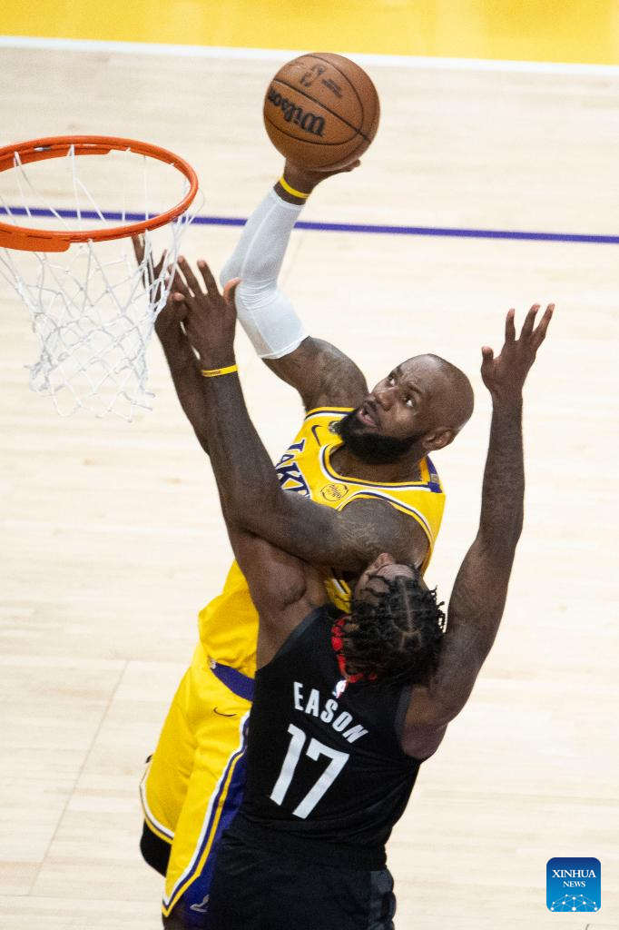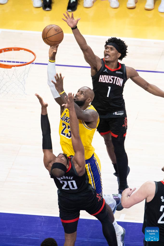 Los Angeles Lakers' LeBron James (C) goes to the basket during the 2025-2026 NBA first-round playoff series basketball match between Los Angeles Lakers and Houston Rockets in Los Angeles, the United States, April 18, 2026. (Photo by Ringo Chiu/Xinhua)