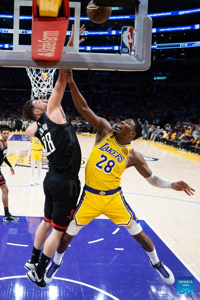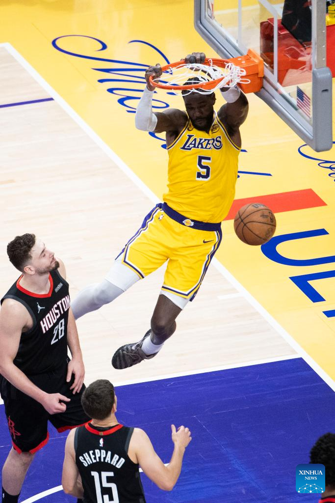 Los Angeles Lakers' Deandre Ayton (top) dunks against the Houston Rockets during the 2025-2026 NBA first-round playoff series basketball match between Los Angeles Lakers and Houston Rockets in Los Angeles, the United States, April 18, 2026. (Photo by Ringo Chiu/Xinhua)