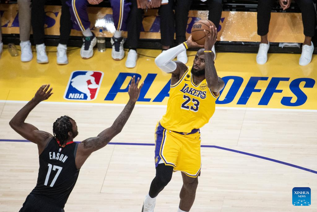 Los Angeles Lakers' LeBron James (R) shoots against Houston Rockets' Tari Eason during the 2025-2026 NBA first-round playoff series basketball match between Los Angeles Lakers and Houston Rockets in Los Angeles, the United States, April 18, 2026. (Photo by Ringo Chiu/Xinhua)