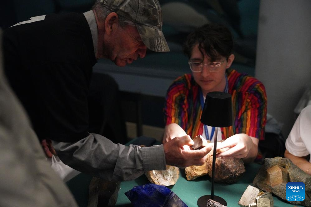 A visitor observes a specimen during a festival celebrating the upcoming Earth Day at the American Museum of Natural History in New York, the United States, on April 18, 2026. An all-ages festival titled Earthfest was held at the American Museum of Natural History in New York on Saturday to celebrate the upcoming Earth Day, an annual event on April 22, with hands-on activities, science trivia, specimen identification stations, and more. (Xinhua/Zhang Fengguo)