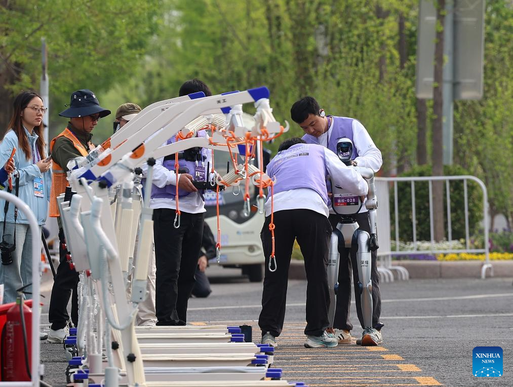 Engineers check the humanoid robot "Tiangong 3.0" (2nd L) of Zhipaozhe Team in the remote-controlled category during the Beijing E-Town half-marathon and humanoid robots half-marathon in the Beijing Economic-Technological Development Area in southeast Beijing, China, April 19, 2026. (Xinhua/Zhai Yifan)