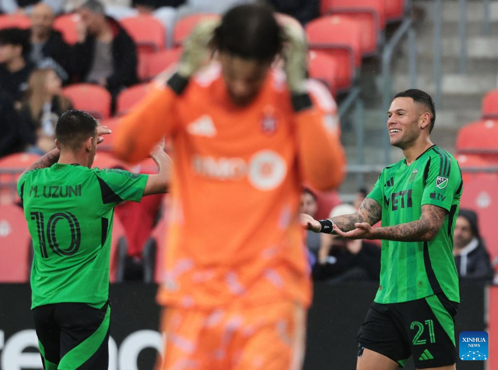 Christian Ramirez (R) of Austin FC celebrates scoring with teammate Myrto Uzuni during the 2026 Major League Soccer (MLS) regular season match between Toronto FC and Austin FC at BMO Field in Toronto, Canada, April 18, 2026. (Photo by Zou Zheng/Xinhua)