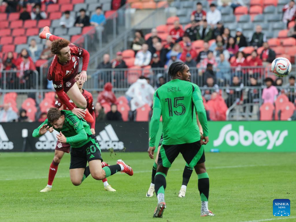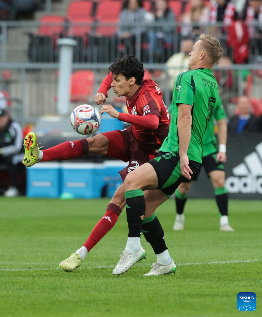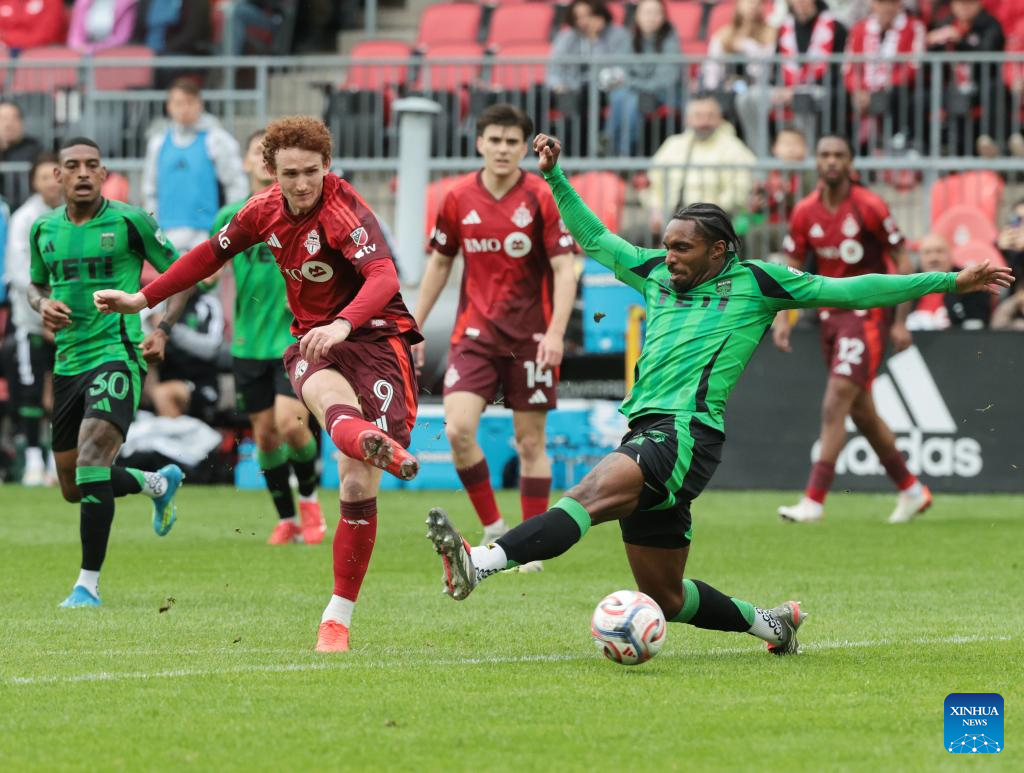 Daniel Salloi (L) of Toronto FC shoots during the 2026 Major League Soccer (MLS) regular season match between Toronto FC and Austin FC at BMO Field in Toronto, Canada, April 18, 2026. (Photo by Zou Zheng/Xinhua)