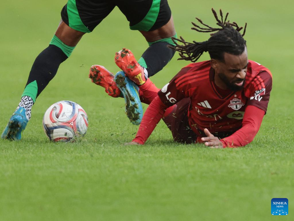 Richie Laryea (R) of Toronto FC reacts during the 2026 Major League Soccer (MLS) regular season match between Toronto FC and Austin FC at BMO Field in Toronto, Canada, April 18, 2026. (Photo by Zou Zheng/Xinhua)