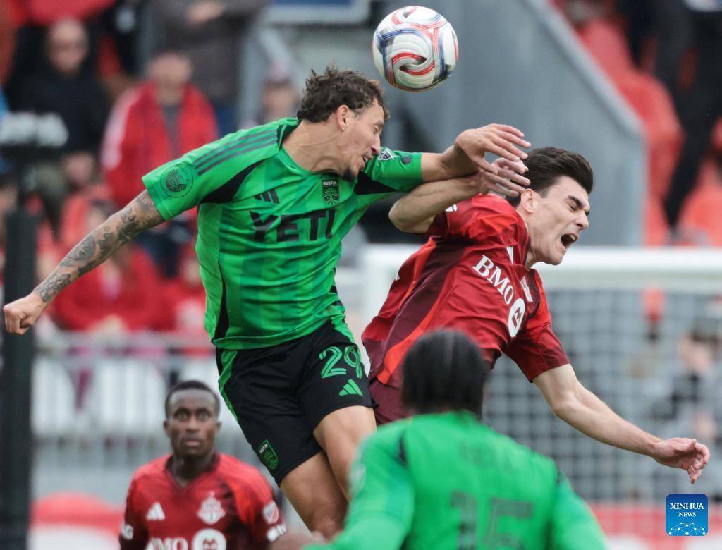 Josh Sargent (L, top) of Toronto FC vies with Nicolas Dubersarsky of Austin FC during the 2026 Major League Soccer (MLS) regular season match between Toronto FC and Austin FC at BMO Field in Toronto, Canada, April 18, 2026. (Photo by Zou Zheng/Xinhua)