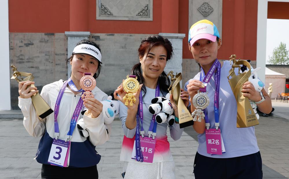 On the human's side of E-Town half-marathon, China's Zhao Haijie took the men's title in one hour, seven minutes, and 47 seconds, while his compatriot Wang Qiaoxia was crowned in the women's race with 1:18:06. ■