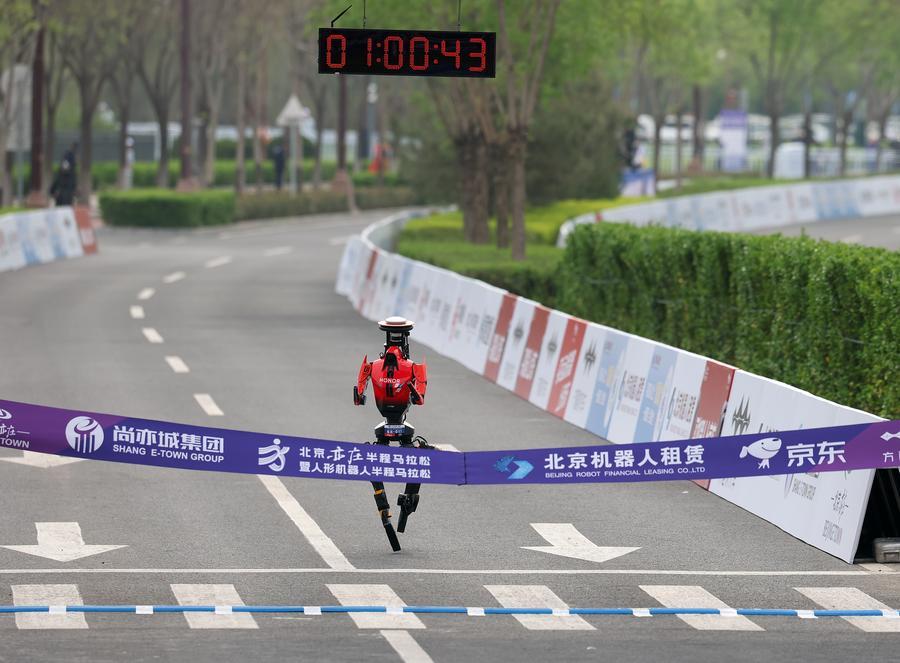 BEIJING, April 19 (Xinhua) -- Humanoid robot named "Flash" from Shenzhen Honor Smart Technology Development Co., Ltd. claimed victory at the 2026 Beijing E-Town half-marathon with a time of 50 minutes and 26 seconds in autonomous navigation on Sunday, beating the human world record of 57:20.