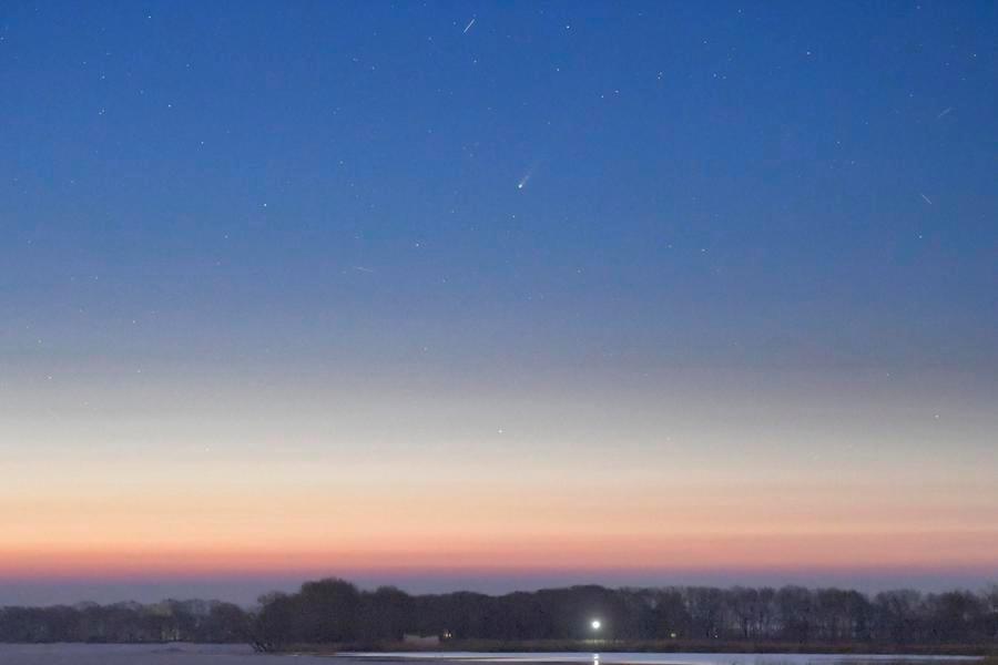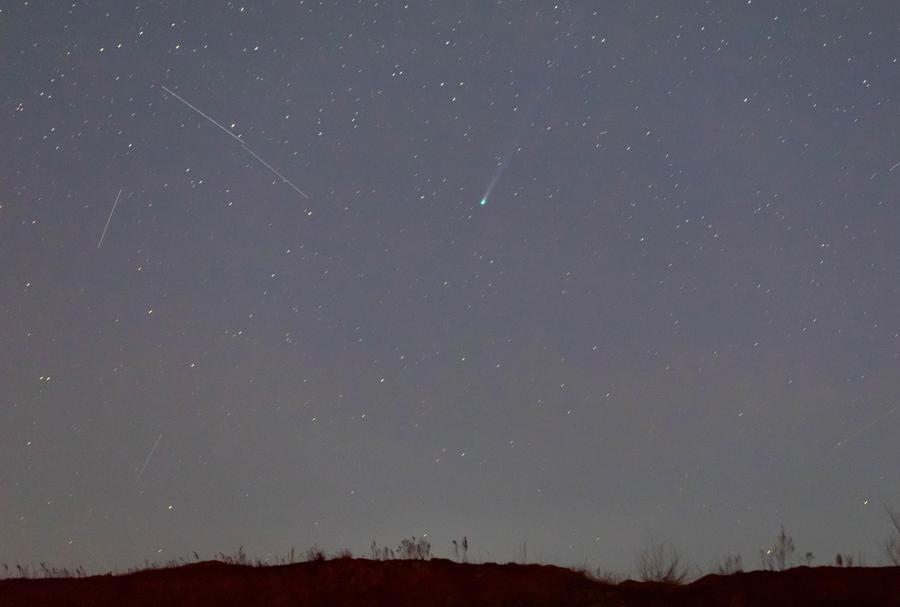 This photo taken on April 18, 2026 shows comet C/2025 R3 in the sky over Qiqihar City, northeast China's Heilongjiang Province. (Photo by Wang Yonggang/Xinhua)