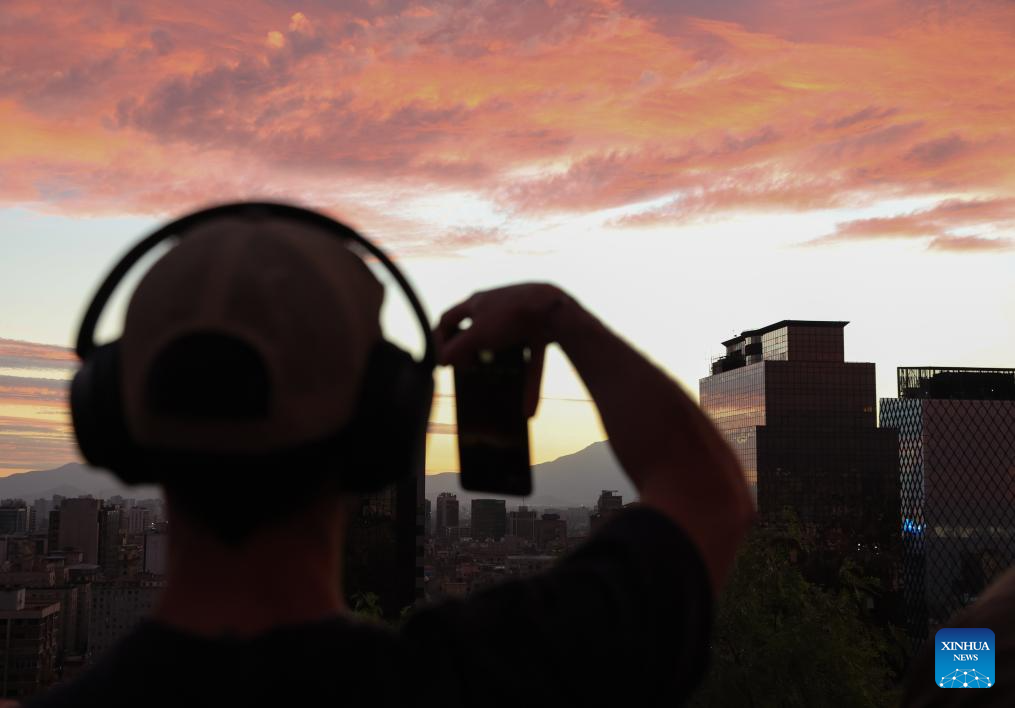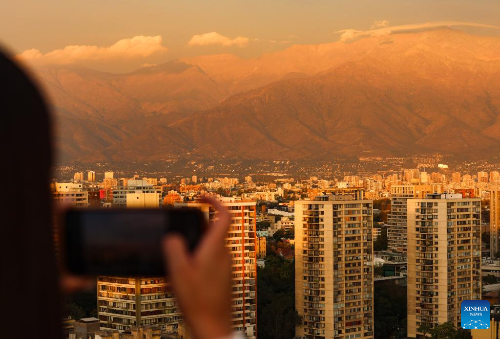 This photo taken on April 18, 2026 shows a view of the skyline at sunset in Santiago, Chile. (Xinhua/Zhou Jiayi)