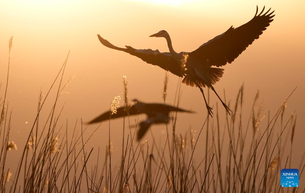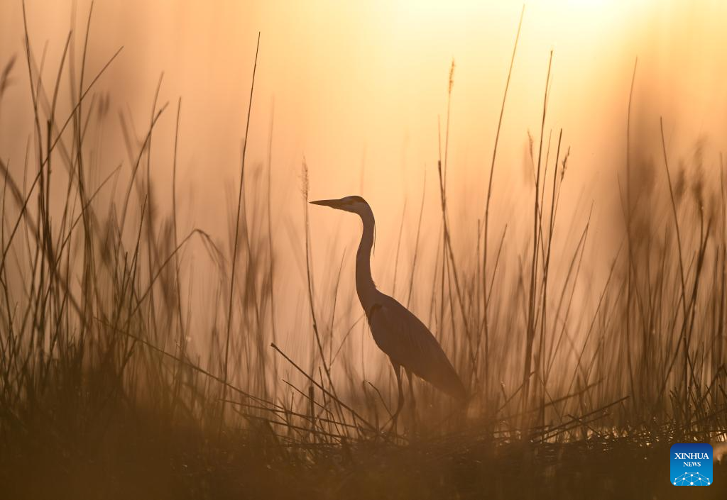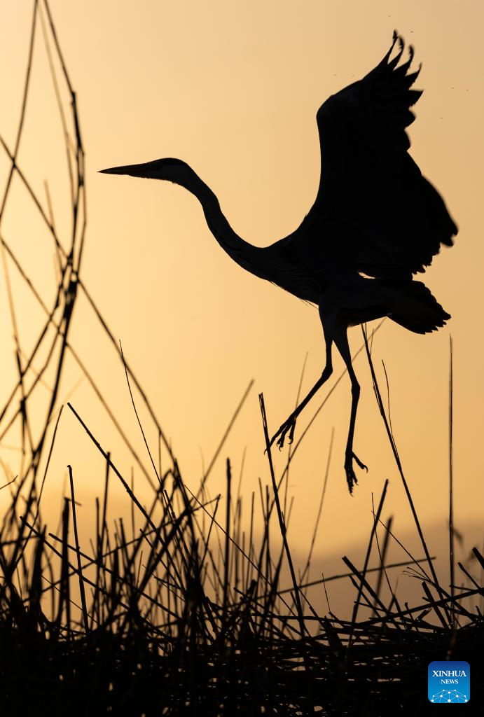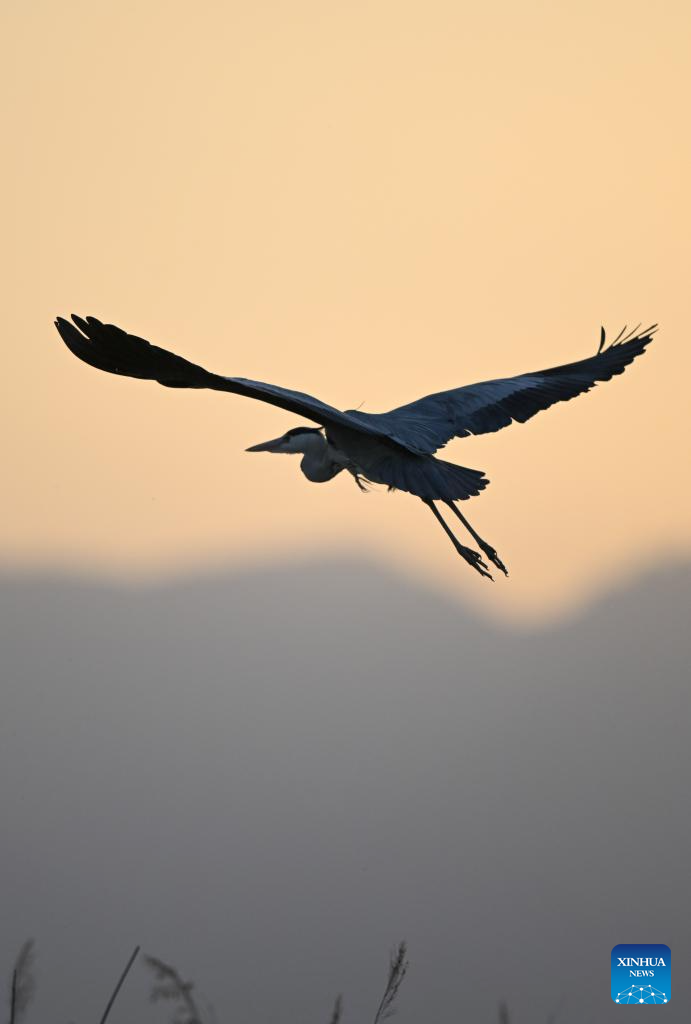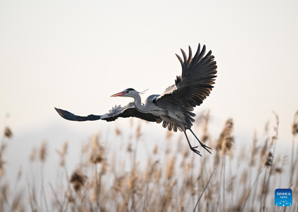 A heron flies over reeds at Shahu scenic area in Pingluo County of Shizuishan City in northwest China's Ningxia Hui Autonomous Region, April 17, 2026. From March to October each year, the Shahu scenic area serves as an important breeding habitat for migratory birds, featuring vast expanses of water, abundant plankton, fish and shrimp, and a variety of ecosystems.
