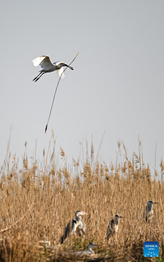 An Eurasian spoonbill holding a reed in mouth flies over the Shahu Lake in Pingluo County of Shizuishan City in northwest China's Ningxia Hui Autonomous Region, April 17, 2026. From March to October each year, the Shahu scenic area serves as an important breeding habitat for migratory birds, featuring vast expanses of water, abundant plankton, fish and shrimp, and a variety of ecosystems.