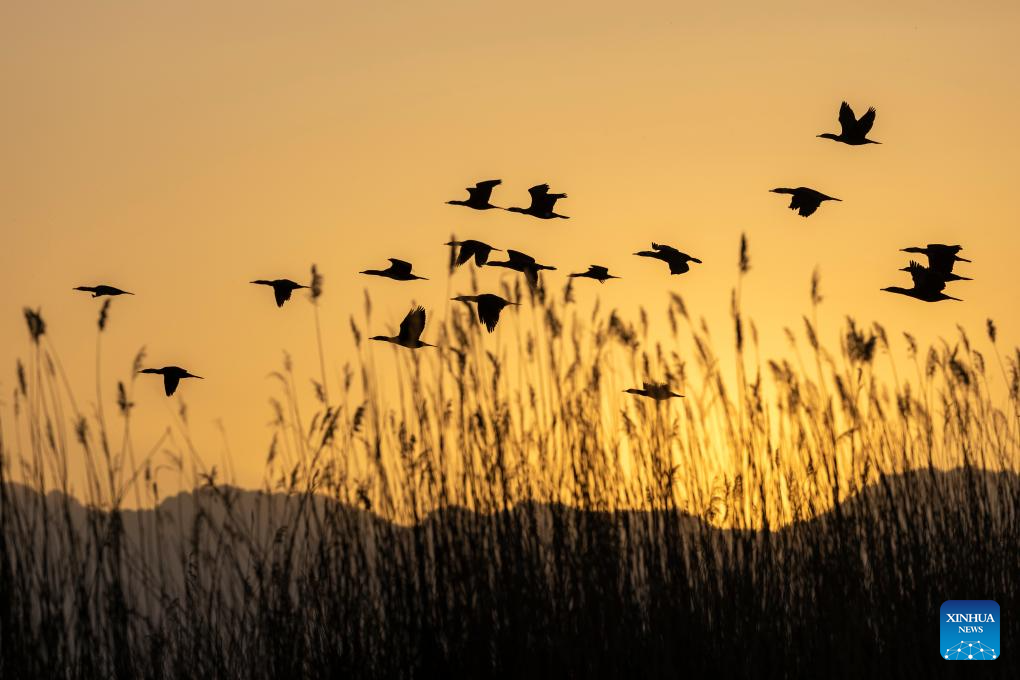 Cormorants fly over reeds at Shahu scenic area in Pingluo County of Shizuishan City in northwest China's Ningxia Hui Autonomous Region, April 17, 2026. From March to October each year, the Shahu scenic area serves as an important breeding habitat for migratory birds, featuring vast expanses of water, abundant plankton, fish and shrimp, and a variety of ecosystems.
