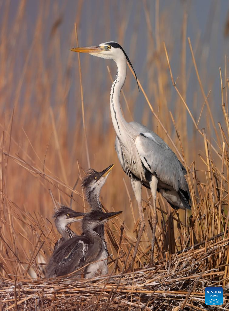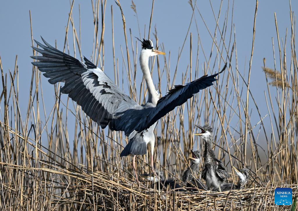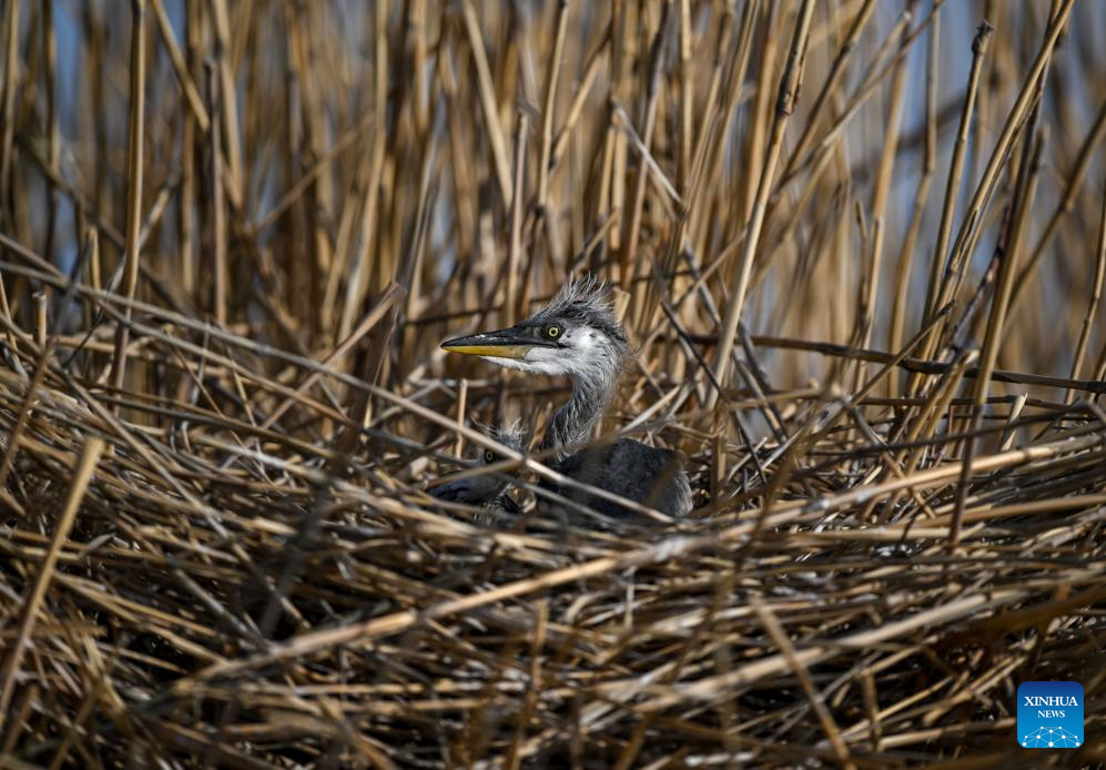 Baby herons are seen at Shahu scenic area in Pingluo County of Shizuishan City in northwest China's Ningxia Hui Autonomous Region, April 18, 2026. From March to October each year, the Shahu scenic area serves as an important breeding habitat for migratory birds, featuring vast expanses of water, abundant plankton, fish and shrimp, and a variety of ecosystems.