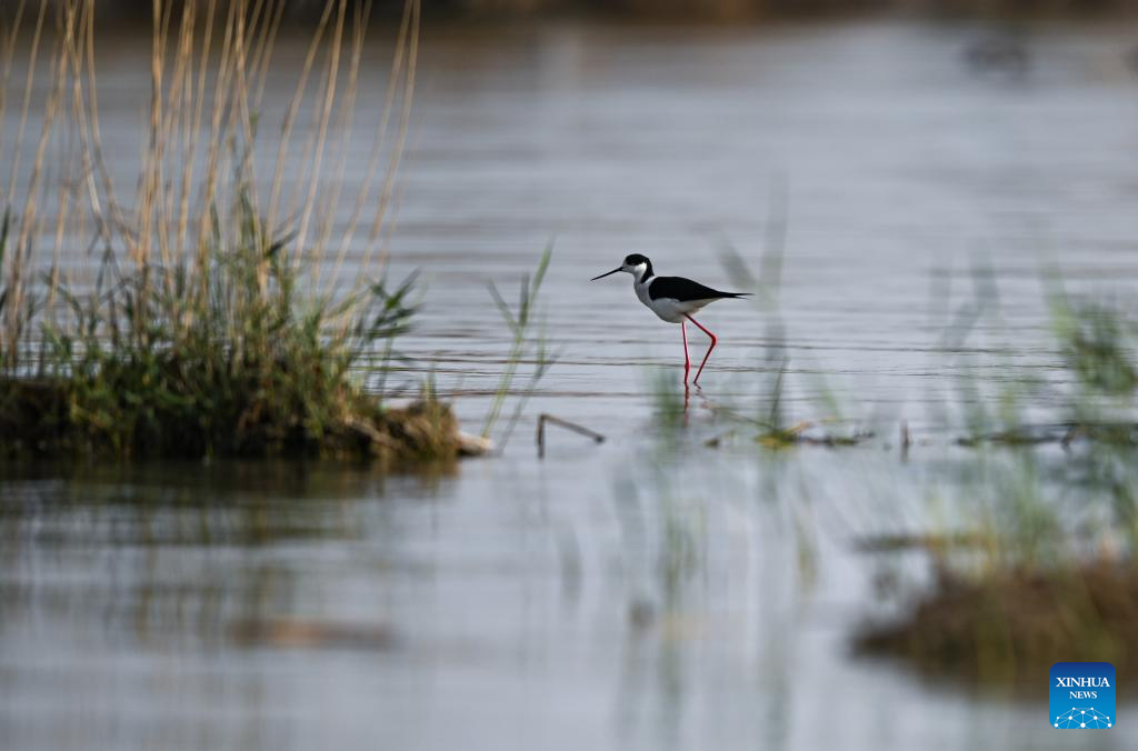 A black-winged stilt forges in Shahu Lake in Pingluo County of Shizuishan City in northwest China's Ningxia Hui Autonomous Region, April 18, 2026. From March to October each year, the Shahu scenic area serves as an important breeding habitat for migratory birds, featuring vast expanses of water, abundant plankton, fish and shrimp, and a variety of ecosystems.