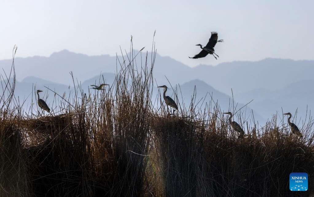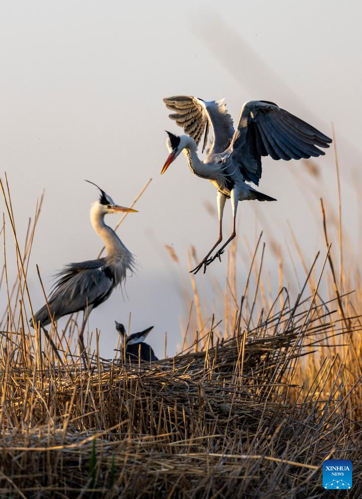 Herons are pictured among reeds at Shahu scenic area in Pingluo County of Shizuishan City in northwest China's Ningxia Hui Autonomous Region, April 18, 2026. From March to October each year, the Shahu scenic area serves as an important breeding habitat for migratory birds, featuring vast expanses of water, abundant plankton, fish and shrimp, and a variety of ecosystems.