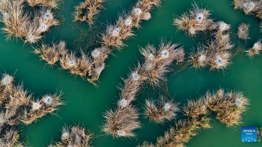 An aerial drone photo taken on April 18, 2026 shows nests of herons at the Shahu scenic area in Pingluo County of Shizuishan City in northwest China's Ningxia Hui Autonomous Region. From March to October each year, the Shahu scenic area serves as an important breeding habitat for migratory birds, featuring vast expanses of water, abundant plankton, fish and shrimp, and a variety of ecosystems.