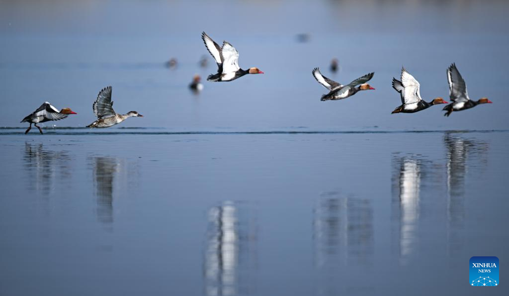 Red-crested pochards fly over Shahu Lake in Pingluo County of Shizuishan City in northwest China's Ningxia Hui Autonomous Region, April 18, 2026. From March to October each year, the Shahu scenic area serves as an important breeding habitat for migratory birds, featuring vast expanses of water, abundant plankton, fish and shrimp, and a variety of ecosystems.