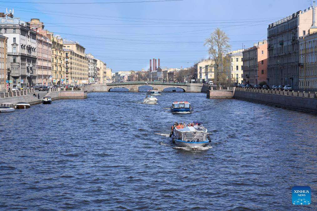 Sightseeing boats travel on the Fontanka River in St. Petersburg, Russia, April 19, 2026. St. Petersburg features a dense network of waterways and over 300 bridges crisscrossing the city. (Photo by Guo Feizhou/Xinhua)