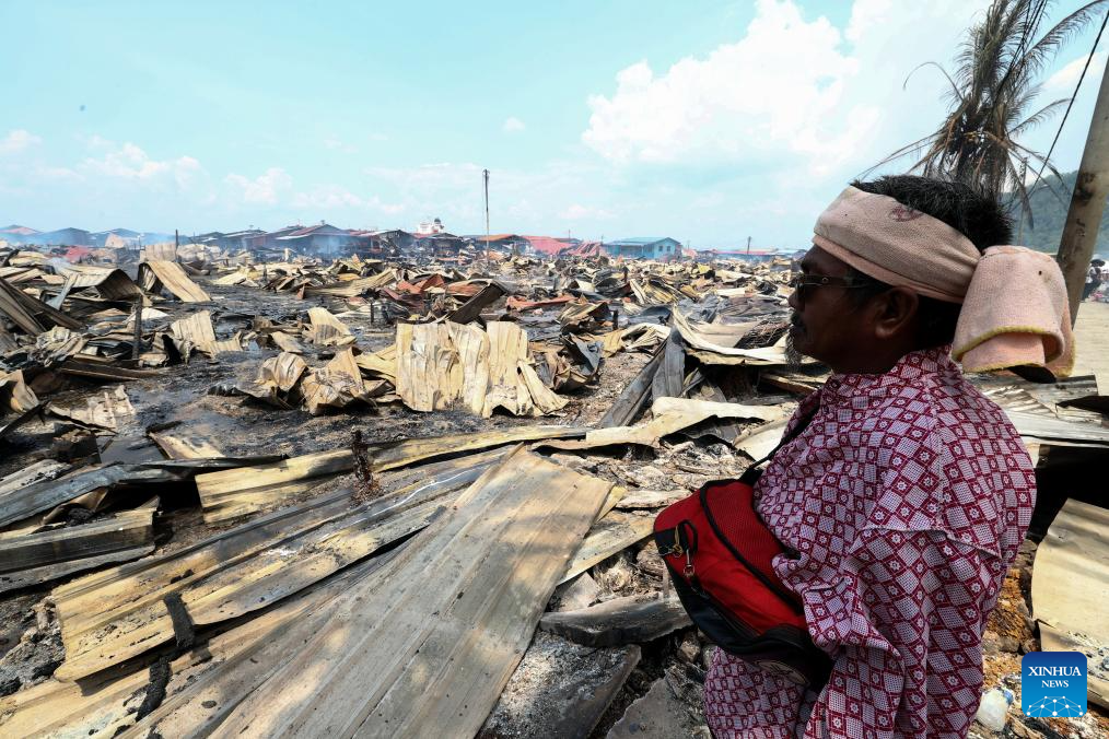 A resident looks at a coastal village after a fire in the northern Borneo state of Sabah, Malaysia, April 19, 2026. An early morning fire in a coastal village in the northern Borneo state of Sabah destroyed about 1,000 houses, affecting more than 9,000 residents, Malaysian authorities said on Sunday. (Bernama/Handout via Xinhua)