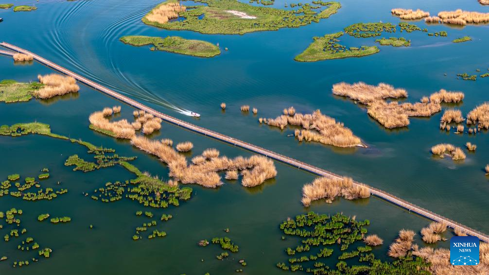 An aerial drone photo taken on April 18, 2026 shows a view of the Shahu scenic area in Shizuishan, northwest China's Ningxia Hui Autonomous Region. (Xinhua/Wang Peng)
