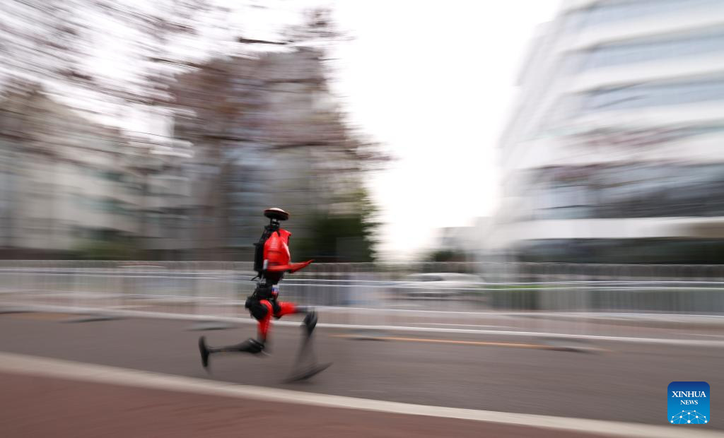 Humanoid robot "Flash" of Qitiandasheng Team in the autonomous category runs during the Beijing E-Town half-marathon and humanoid robots half-marathon in the Beijing Economic-Technological Development Area in southeast Beijing, capital of China, April 19, 2026. (Xinhua/Luo Yuan)