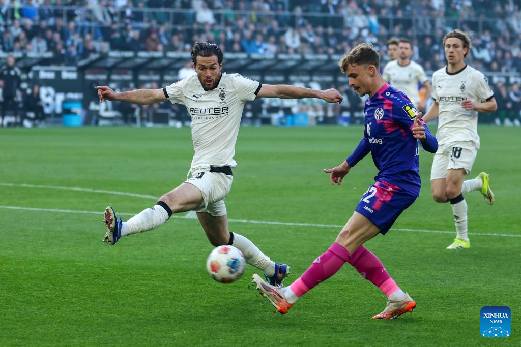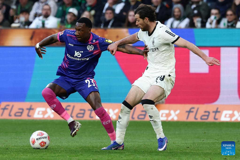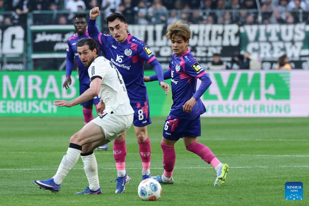 Joe Scally (L) of Borussia Moenchengladbach vies with Paul Nebel (C) of FSV Mainz 05 during the German first division Bundesliga football match between Borussia Moenchengladbach and FSV Mainz 05 in Moenchengladbach, Germany, April 19, 2026. (Photo by Joachim Bywaletz/Xinhua)