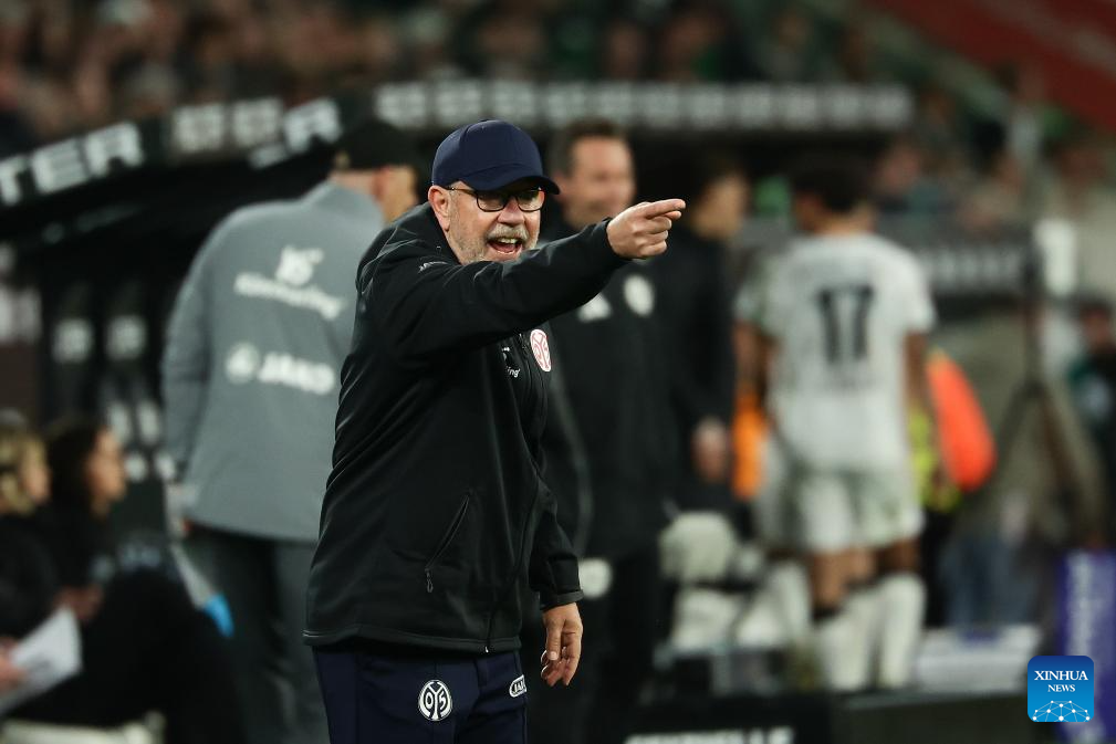 Urs Fischer, head coach of FSV Mainz 05, gestures during the German first division Bundesliga football match between Borussia Moenchengladbach and FSV Mainz 05 in Moenchengladbach, Germany, April 19, 2026. (Photo by Joachim Bywaletz/Xinhua)