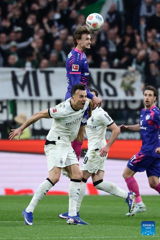 Stefan Posch (top) of FSV Mainz 05 heads for the ball during the German first division Bundesliga football match between Borussia Moenchengladbach and FSV Mainz 05 in Moenchengladbach, Germany, April 19, 2026. (Photo by Joachim Bywaletz/Xinhua)