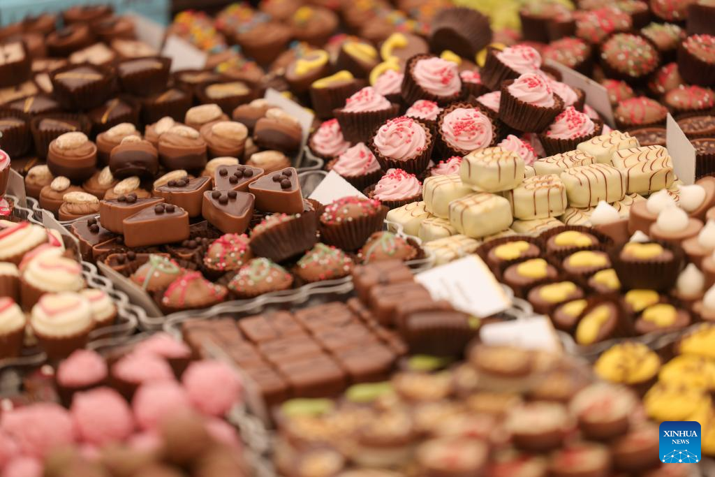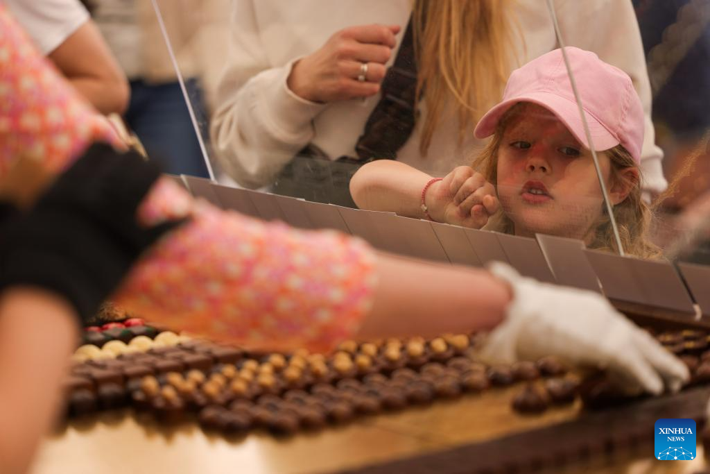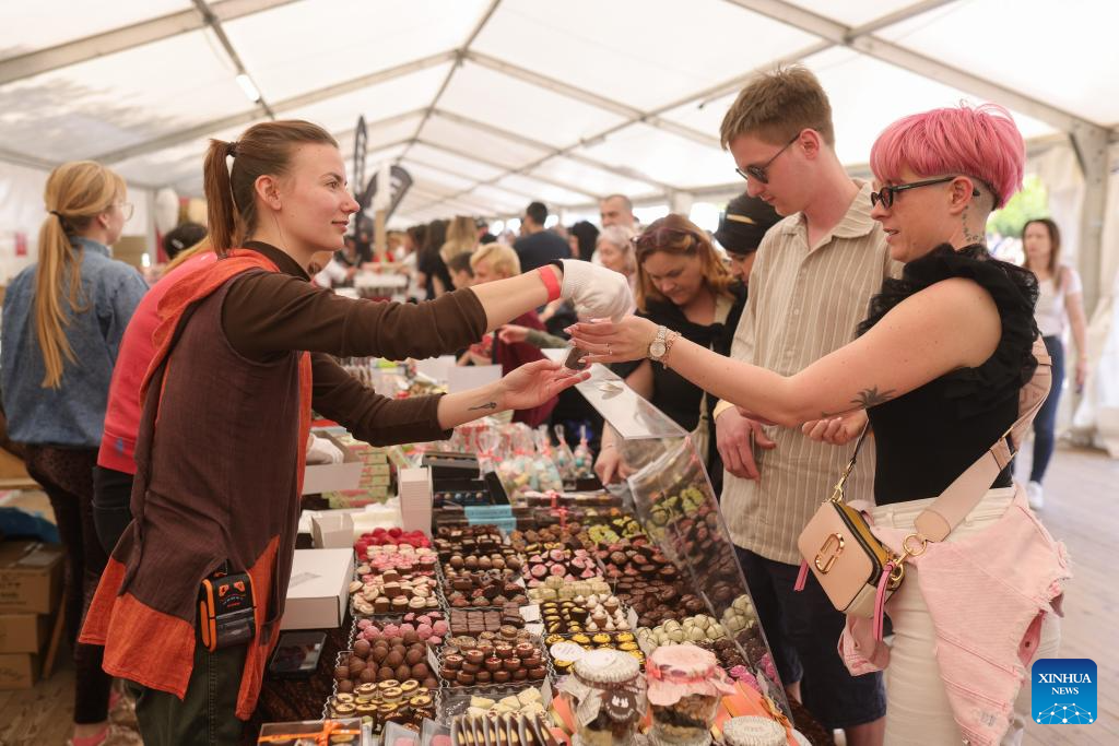 Visitors buy chocolates during the Radovljica Chocolate Festival in Radovljica, Slovenia, April 19, 2026. (Photo by Zeljko Stevanic/Xinhua)