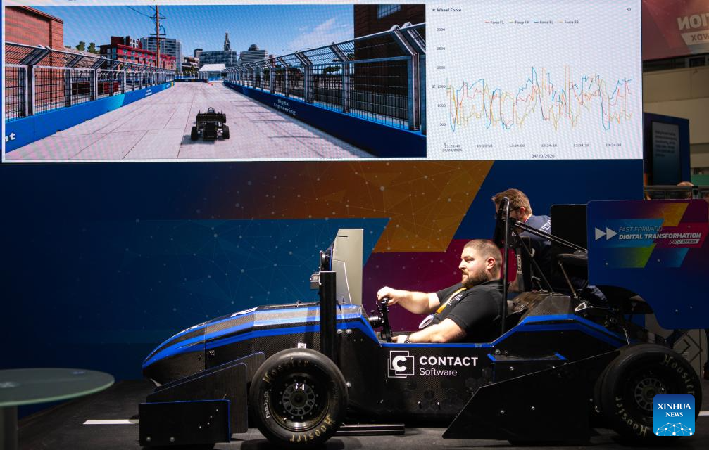 A man tries a racing simulator at Hannover Messe 2026 in Hannover, Germany, April 20, 2026.