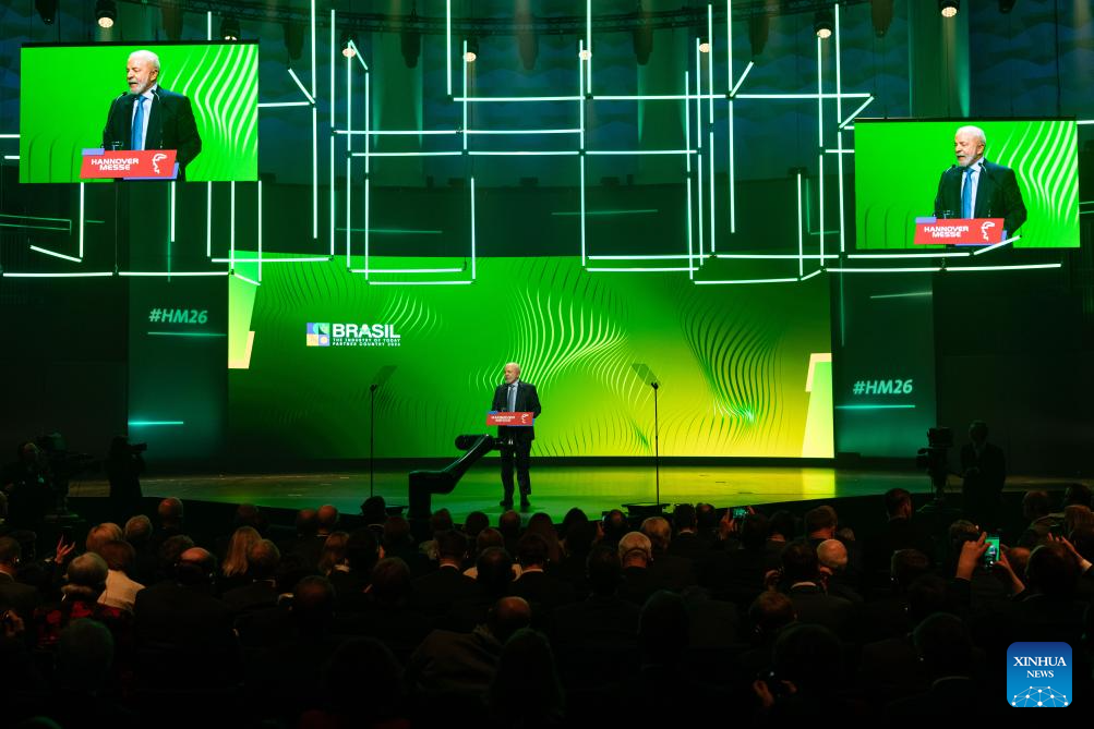 Brazilian President Luiz Inacio Lula da Silva addresses the opening ceremony of Hannover Messe 2026 in Hannover, Germany, April 19, 2026.
