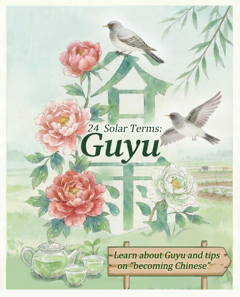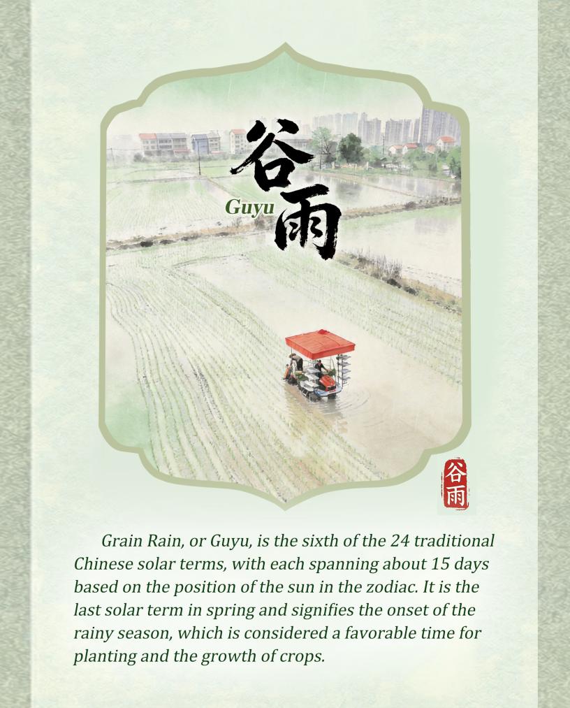 BEIJING, April 20 (Xinhua) -- Grain Rain, or Guyu, falls on April 20 this year. It is the sixth of the 24 traditional Chinese solar terms, with each spanning about 15 days based on the position of the sun in the zodiac. It is the last solar term in spring and signifies the onset of the rainy season, which is considered a favorable time for planting and the growth of crops.