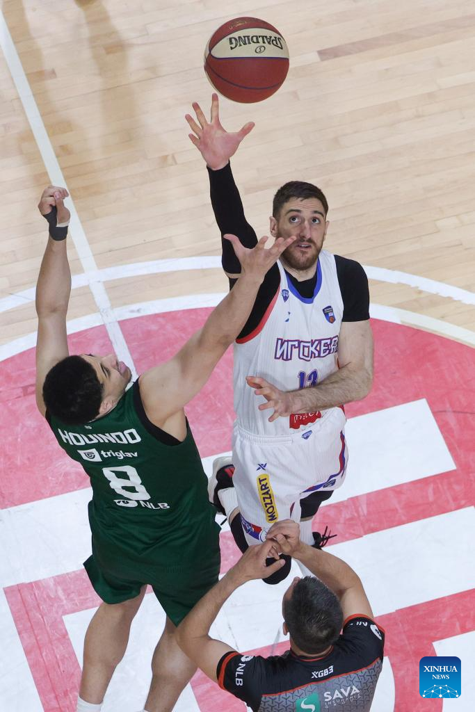 Cameron Toussaint Selidji Houindo (L) of Cedevita Olimpija jumps for the ball against Aleksandar Lazic of Igokea M:Tel during an ABA Basketball League match between Cedevita Olimpija and Igokea M:Tel in Ljubljana, Slovenia, April 19, 2026. (Photo by Zeljko Stevanic/Xinhua)