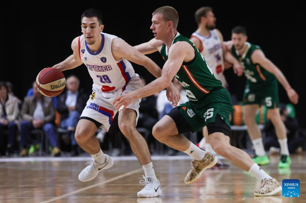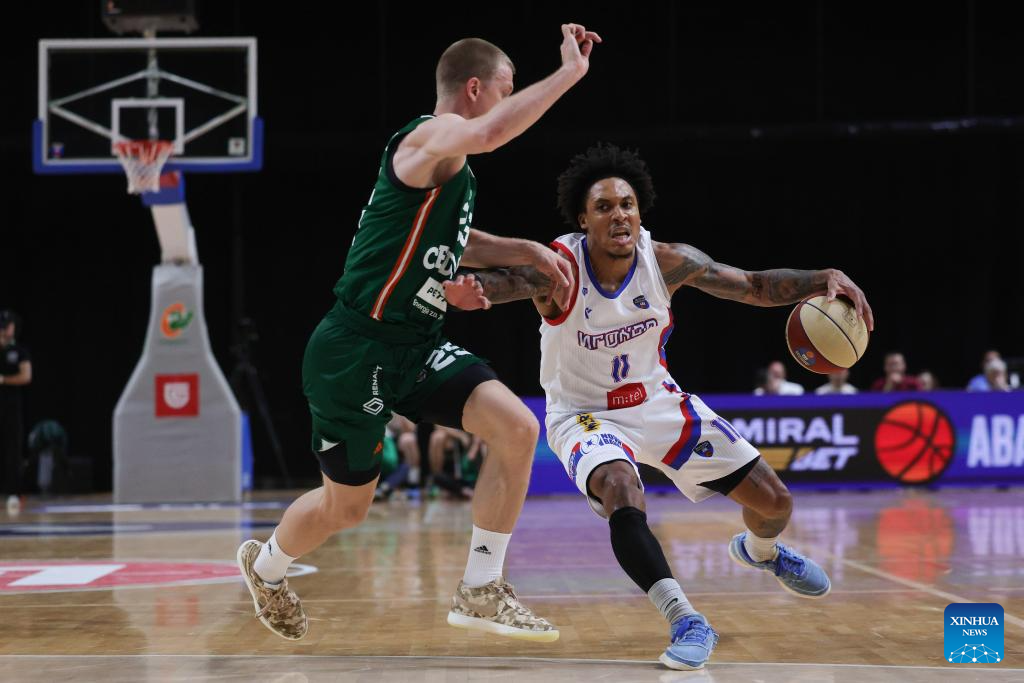 Nathaniel Amir Pierre-Louis (R) of Igokea M:Tel vies with Ognjen Jaramaz of Cedevita Olimpija during an ABA Basketball League match between Cedevita Olimpija and Igokea M:Tel in Ljubljana, Slovenia, April 19, 2026. (Photo by Zeljko Stevanic/Xinhua)